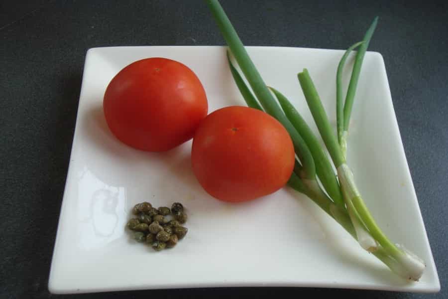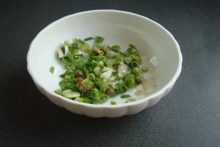 En un pocillo, mezclar el cebollín picado fino, alcaparras y el ajo machacado. Sazonar a gusto.