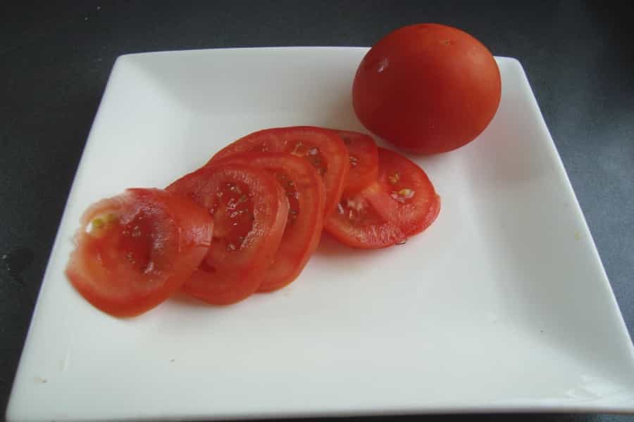 Lavar los tomates, eliminar los extremos y cortar rodajas bien finas.
