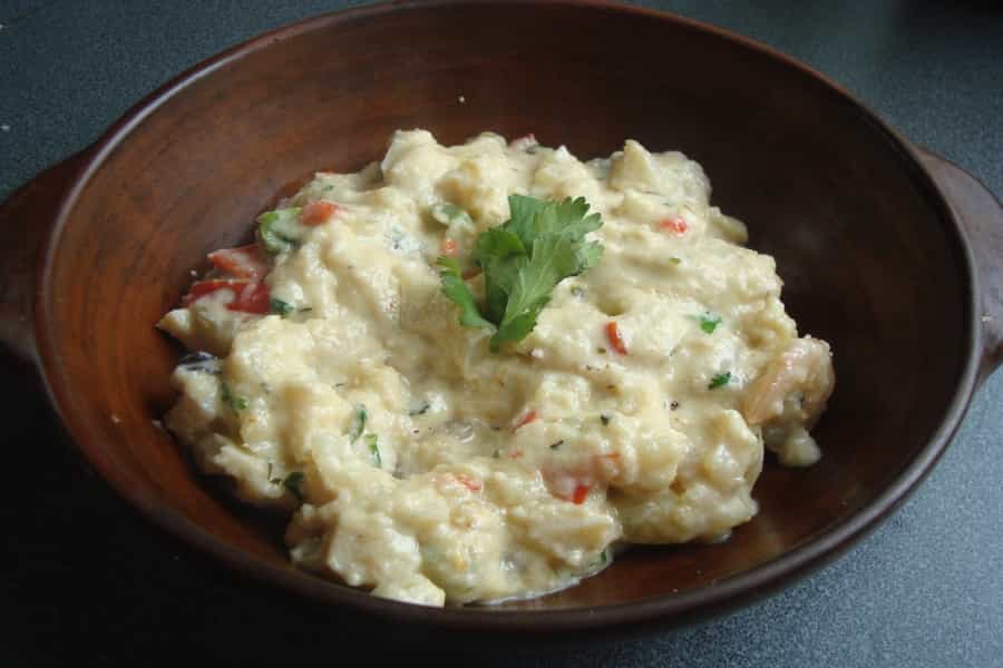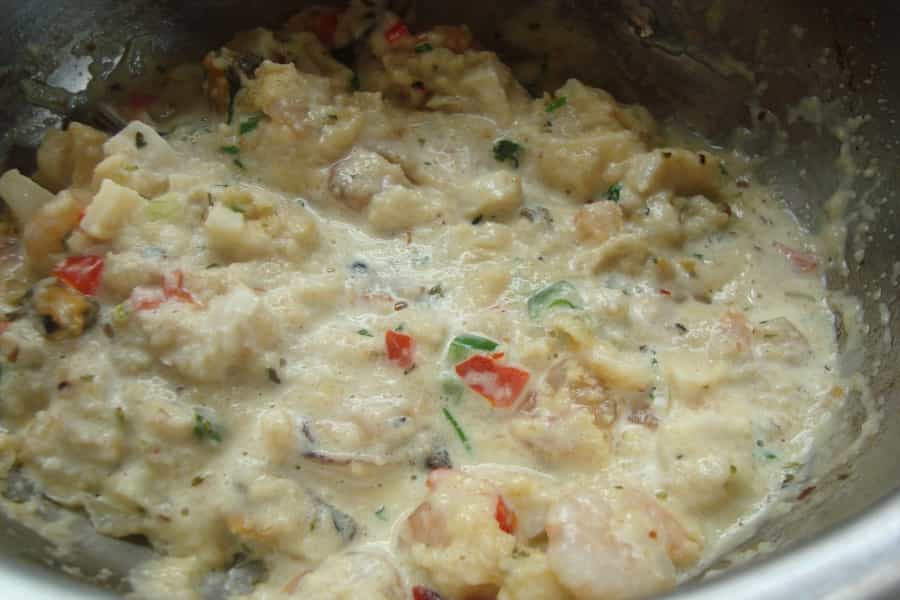 Ir agregando caldo de la cocción de los mariscos si fuese necesario. Añadir pan rallado y crema, rectificar la sazon y revolver suavemente hasta integrar bien.