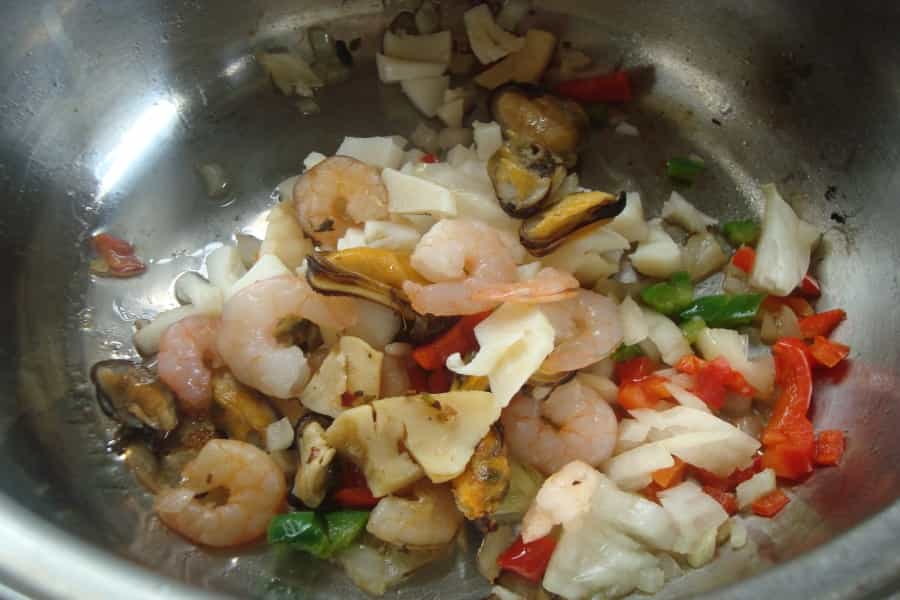 Si utilizas mariscos frescos, lavarlos y cocinarlos en abundante agua caliente hasta que hiervan. Apagar, escurrir (reservar el liquido de la cocción), eliminar las conchas y dejar la carne.