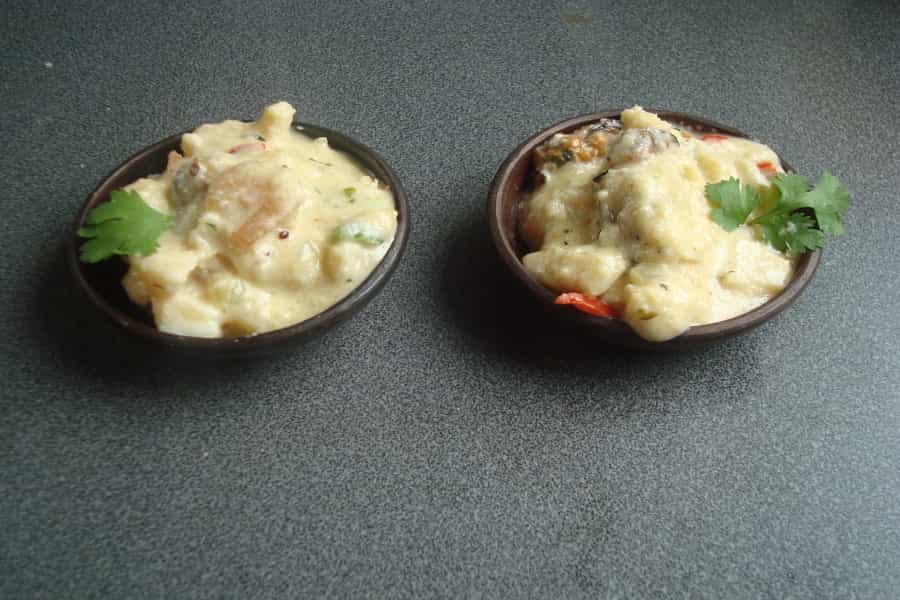 Cocinar a fuego bajo por 10 minutos. Traspasar el chupe de mariscos a pailas de greda o pocillos aptos para horno. Espolvorear con queso rallado y gratinar por 10 minutos. Retirar del horno y servir.