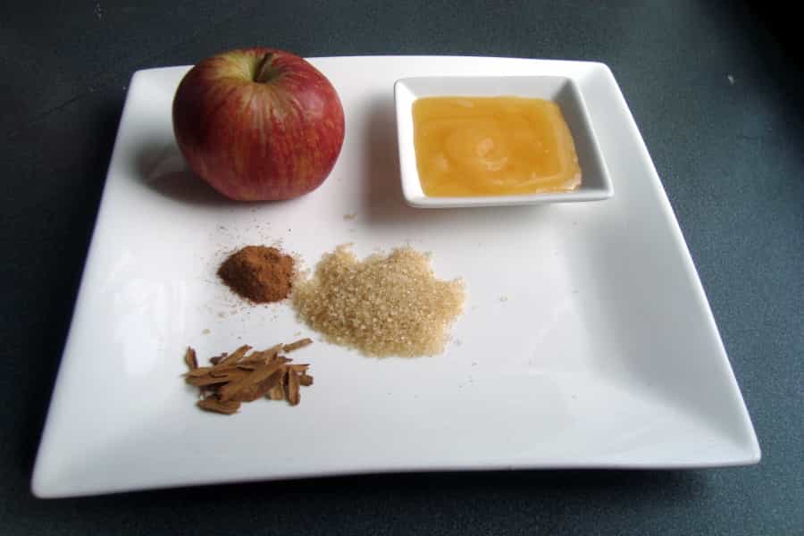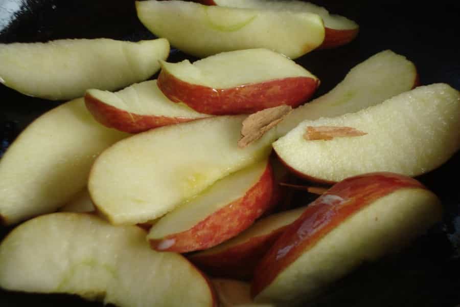 Lavar las manzanas, cortarlas en 8 partes. Eliminar el centro y las semillas. (Si no te gusta la cáscara de la manzana, puedes pelarla completamente). En un sartén con 2 cucharadas de mantequilla caliente, saltear los gajos de manzana con el palito de canela. Cocinar a fuego bajo hasta que doren un poco.