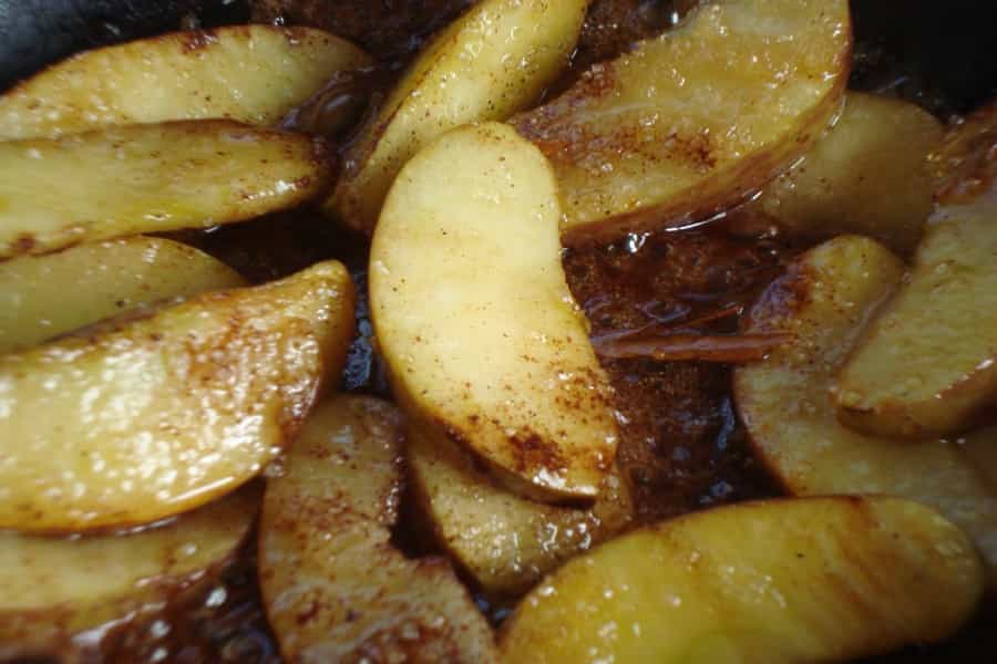 Incorporar la miel y espolvorear azúcar rubia y canela. Seguir la cocción hasta que el azúcar se haya desintegrado. Cuando la miel y el azúcar hayan formado una especie de salsa homogénea, apagar.