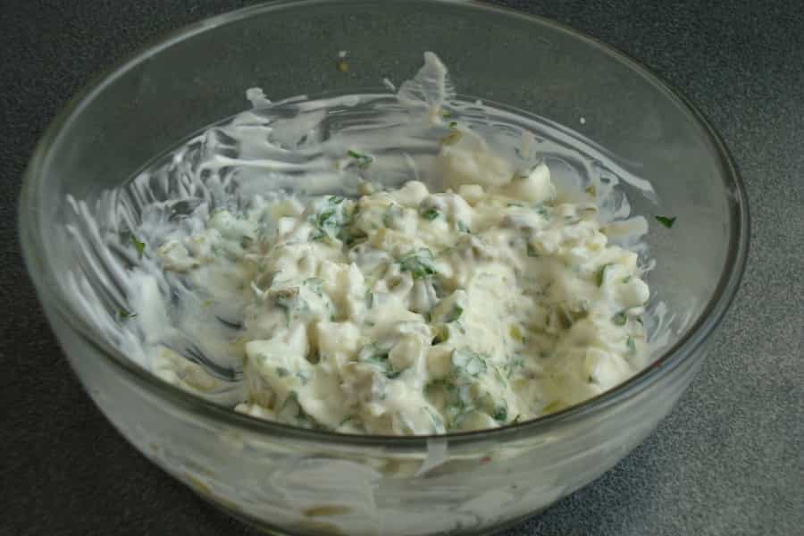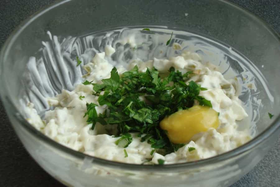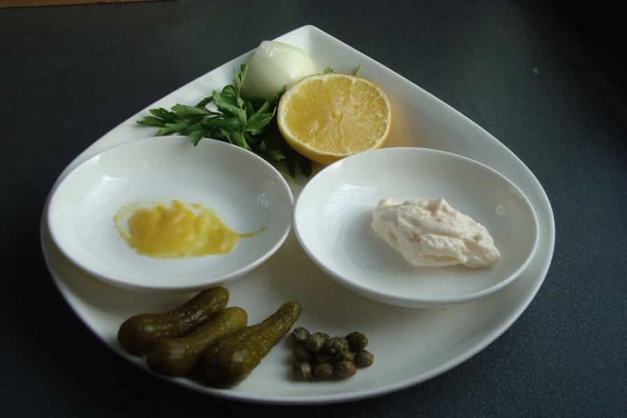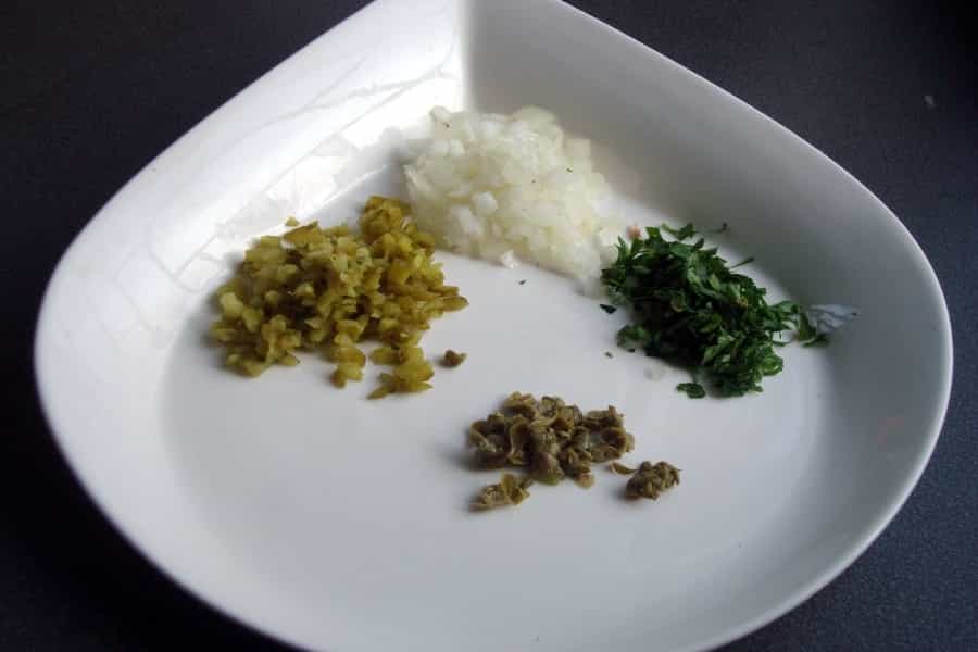 En un pocillo mezclar mayonesa, cebolla, pepinillos y alcaparras, todo picado finamente. Revolver suavemente hasta integrar bien. Añadir perejil picado, mostaza y el jugo de ½ limón.