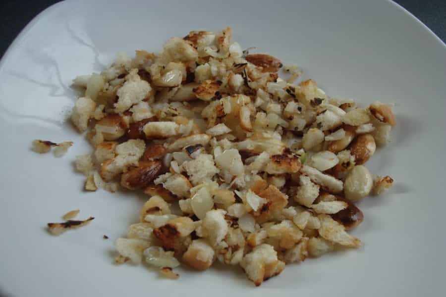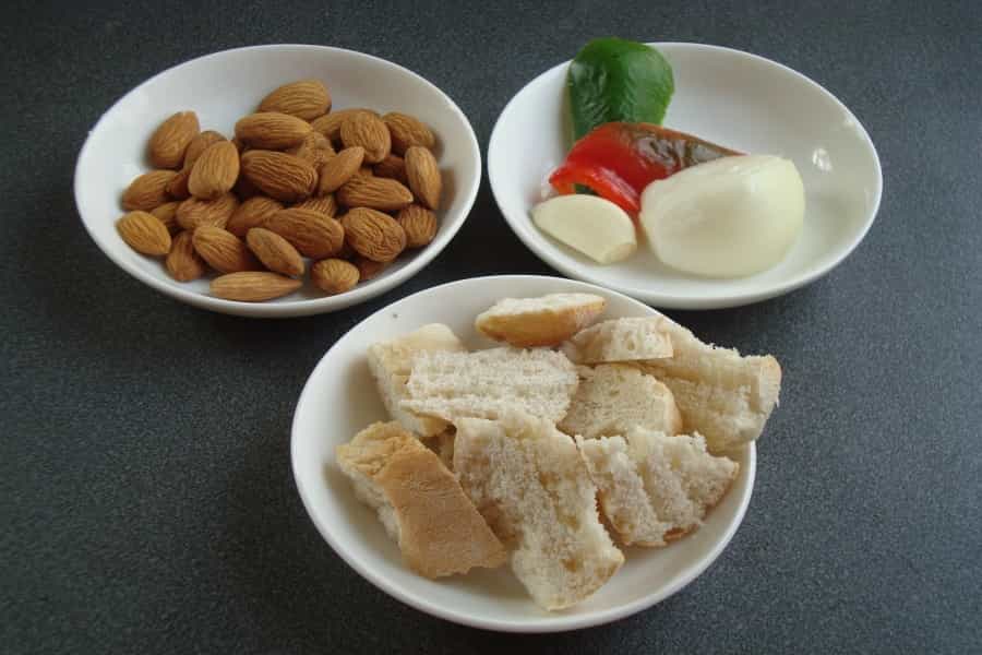 En una olla con 1 cucharada de aceite caliente freír las almendras hasta que estén levemente doradas. Retirar. En el mismo aceite, saltear la cebolla, ajo y pimentón, todo picado finamente. Cocinar a fuego bajo por 10 minutos, agregar el pan cortado en cubos pequeños, salpimentar a gusto y seguir cocinando por 5 minutos. Revolver constantemente. Una vez que el pan se torne dorado, verter sobre las almendras.