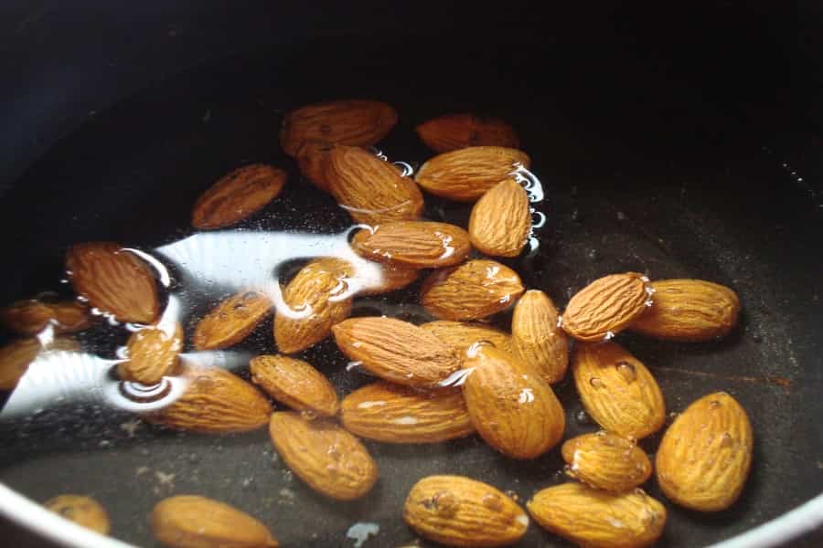 En una olla con abundante agua caliente cocinar las almendras hasta que hiervan. Apagar, dejar enfriar y pelar.