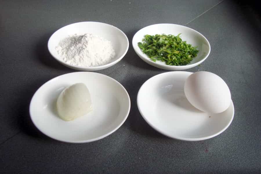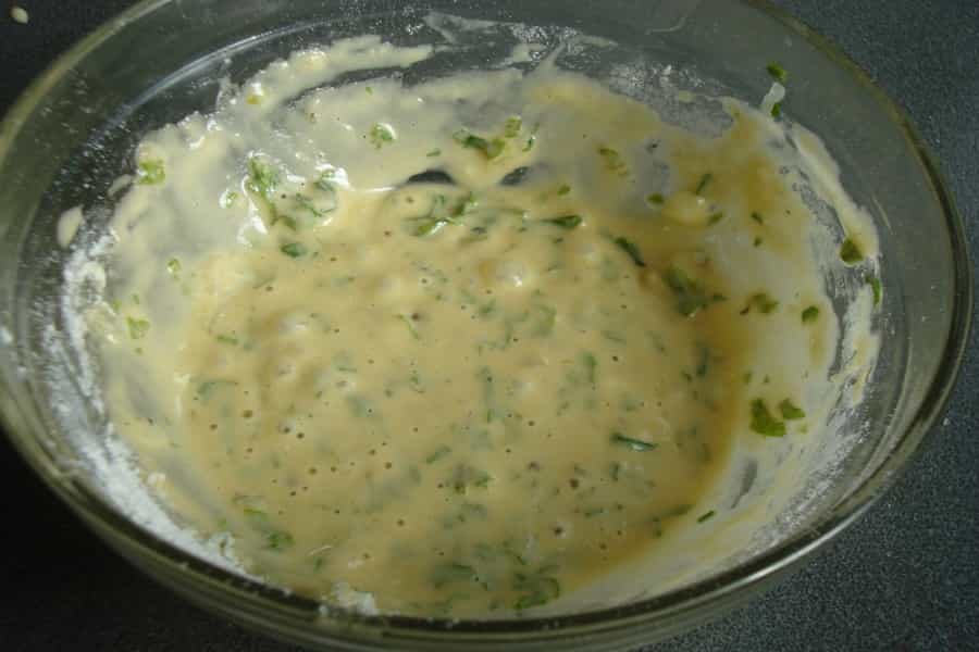 En un recipiente batir la clara de 1 huevo. Cuando esté a nieve incorporar la yema y seguir batiendo hasta integrar totalmente. Añadir la cebolla, perejil y salpimentar a gusto, revolver. Incorporar harina y polvos de hornear cernidos. Revolver suavemente e incorporar un poco de agua (unas 3 cucharadas) hasta obtener un batido húmedo.