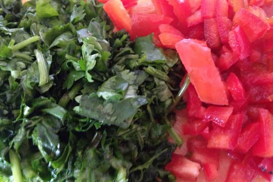 Luego, picas el pimentón rojo y el cilantro. Recuerda lavar la verdura antes de usarla.