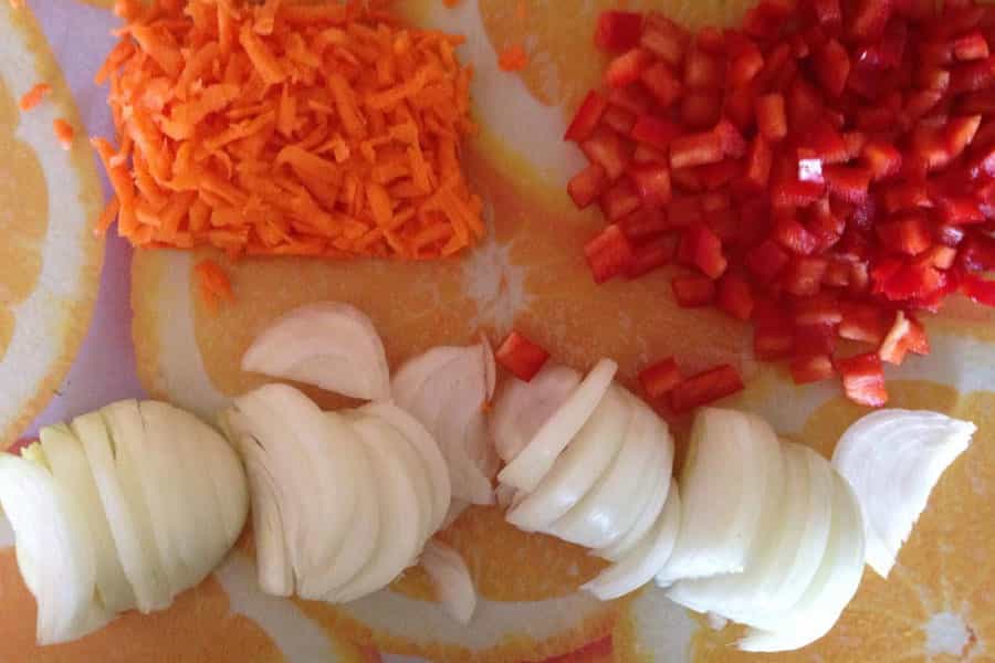 Primero debes picar las verduras. La cebolla puede ir en pluma o en cuadros. A mí me gusta más en pluma, por lo que la corté así.
