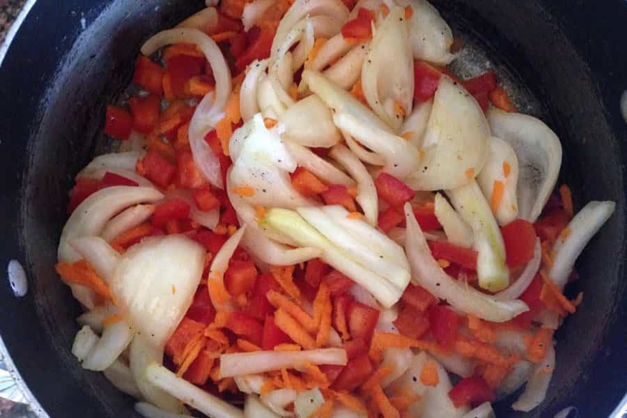 En un sartén, agregas las verduras y sofríe con aceite. Le puedes echar sal y pimienta a gusto. Cuando las lentejas ya están lavadas, ponlas también en el sartén.