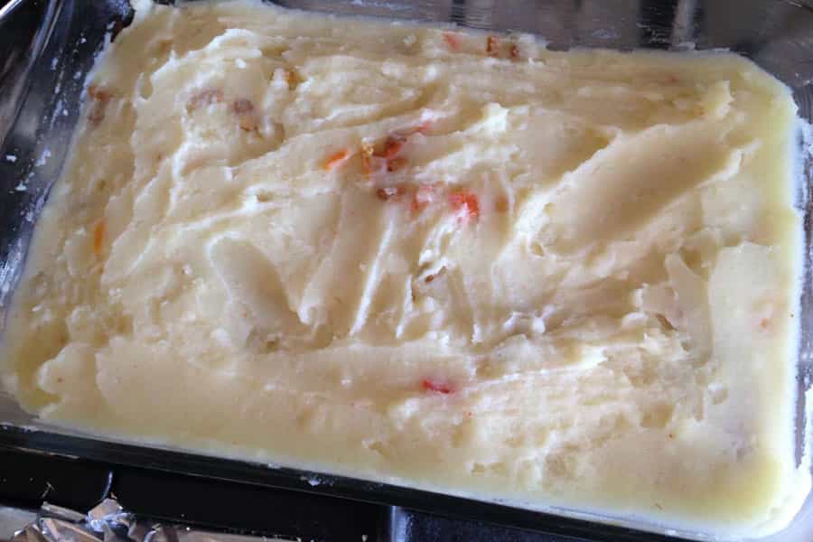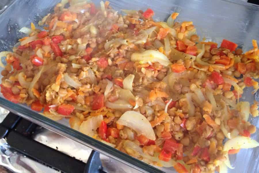 En una fuente enmantequillada pones la base de nuestro sofrito con lentejas. Encima le agregarás el puré.