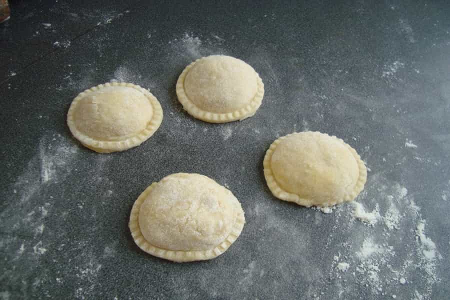 Si no tienes una maquina para hacer los sorrentinos, puedes cortar círculos de unos 5 centímetros. Rellena uno y, con otro círculo de masa, tapa y sella.