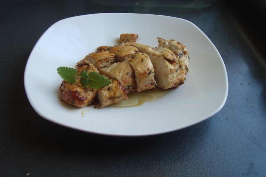 Transcurrido el tiempo de marinado, en un sartén con 1 cucharada de aceite caliente, grillar las pechugas de pollo marinadas (sin el líquido). Sellar por ambos lados hasta que queden doradas. Verter el liquido del marinado y cocinar a fuego medio por 3 minutos. Apagar, dejar reposar por 5 minutos, cortar y servir.