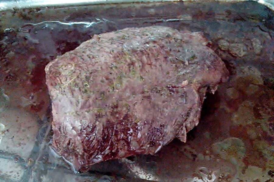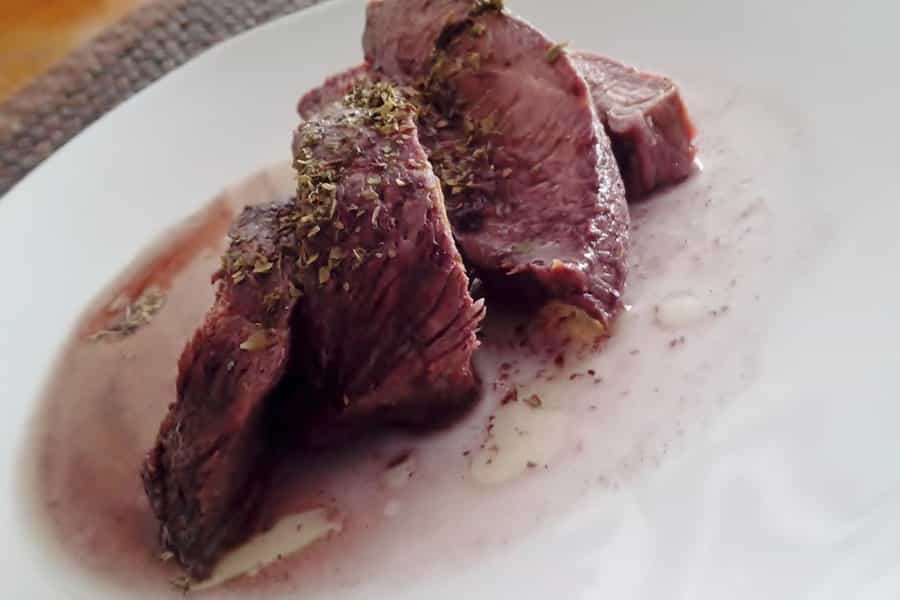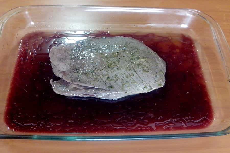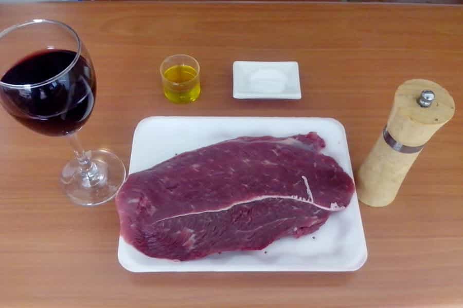 Mientras tanto, en un sartén con aceite caliente, cocina la carne hasta que se selle. Generalmente, con 2 a 3 minutos por lado es suficiente. Después, ponla en una fuente para horno y salpimienta. Agrega el agua y el vino tinto.