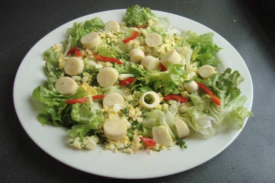 Hace rato que las ensaladas dejaron de ser aburridas y solo de color verde. Actualmente contamos con una gran variedad de ingredientes, con los que podemos crear platos únicos y deliciosos, y este es uno de ellos: Ensalada de palmito con aderezo de huevo, elaborada con los más frescos ingredientes, cuya perfecta mezcla de sabores hará de tu paladar un verdadero festín.
