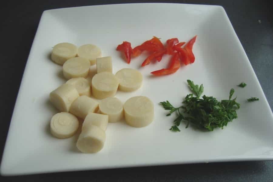 Picar el palmito en rodajas, el pimentón en tiras y la mitad del perejil finamente.