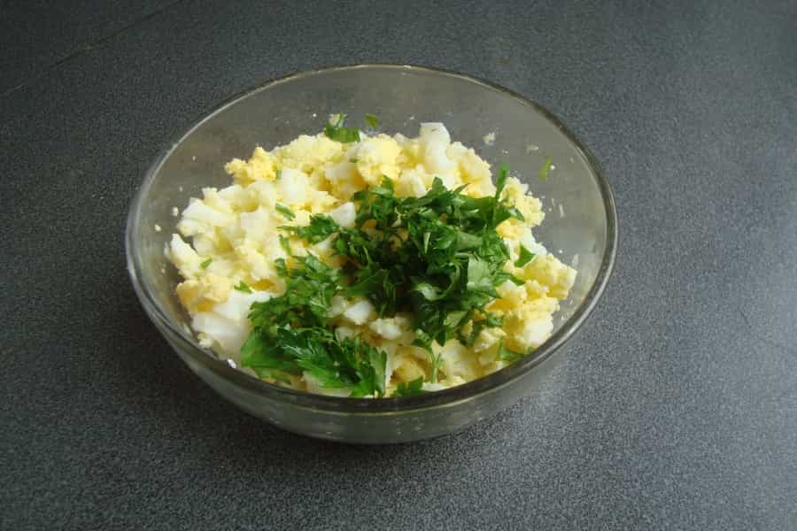 En un pocillo mezclar dos huevos duros molidos, el perejil picado, jugo de 1 limón, sal marina, merquén a gusto y aceite de oliva. Revolver hasta formar un aderezo homogéneo.