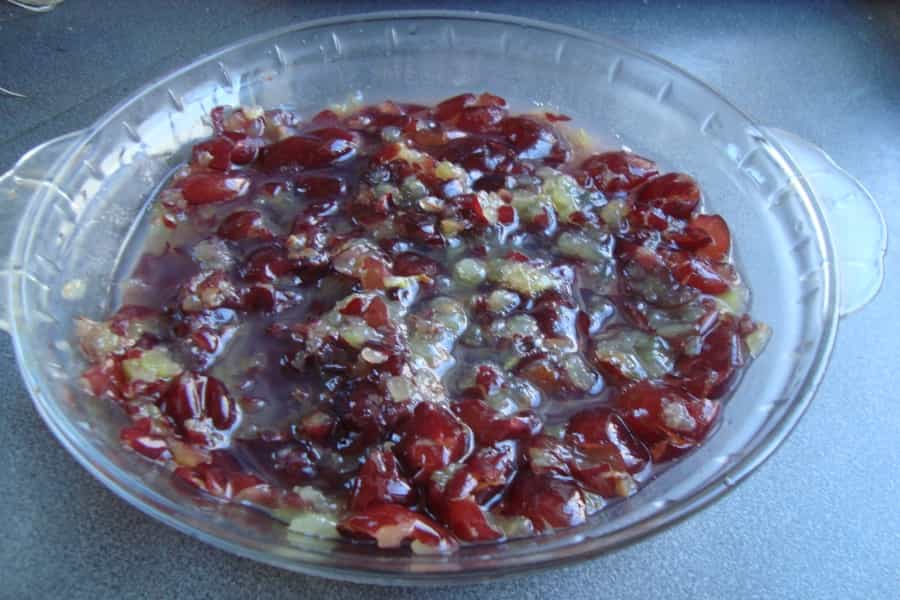 En una olla, mezclar el jugo de uva con azúcar. Cocinar a fuego medio hasta que hierva, incorporando la maicena disuelta y el resto del líquido de la cocción. Cocinar por 4 minutos revolviendo constantemente.