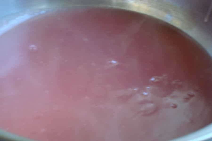 Colar para separar el jugo de uvas de los hollejos y las pepas. En una olla cocinar las pepas, los hollejos, canela en rama, clavos de olor y 1 taza de agua. Dejar que hierva durante 5 minutos, apagar, colar y enfriar.