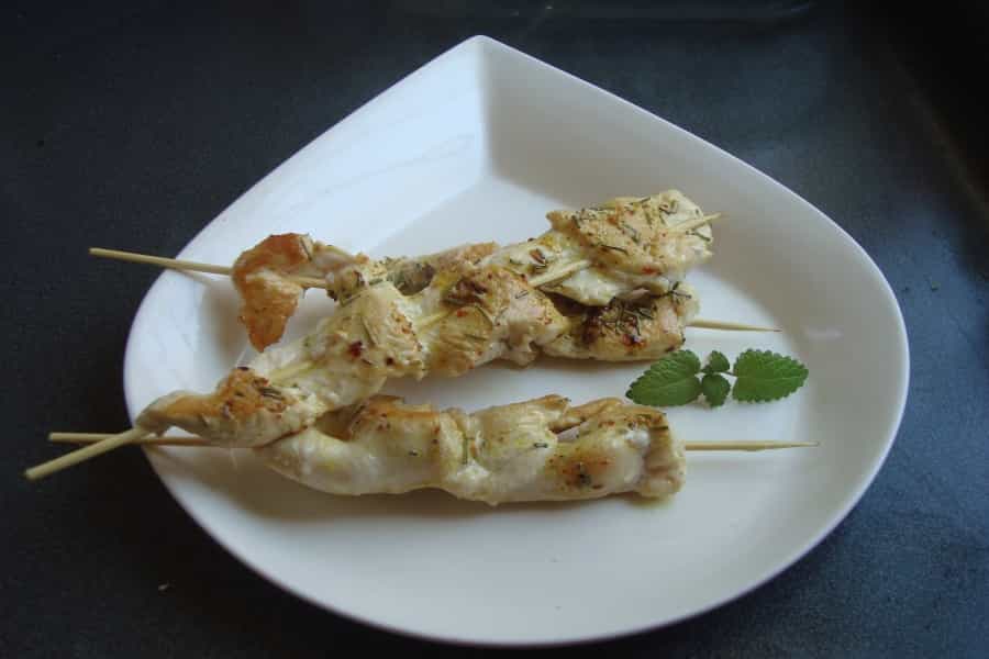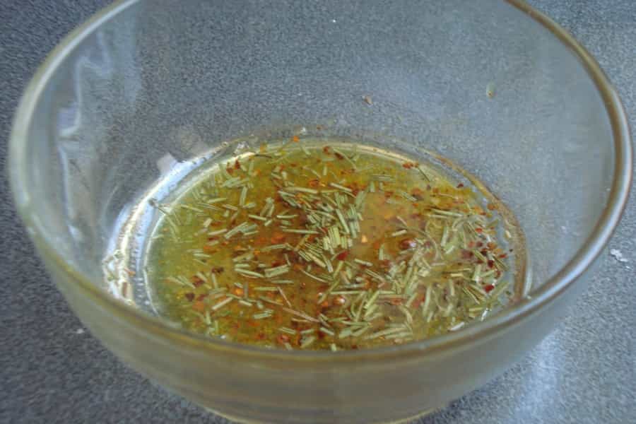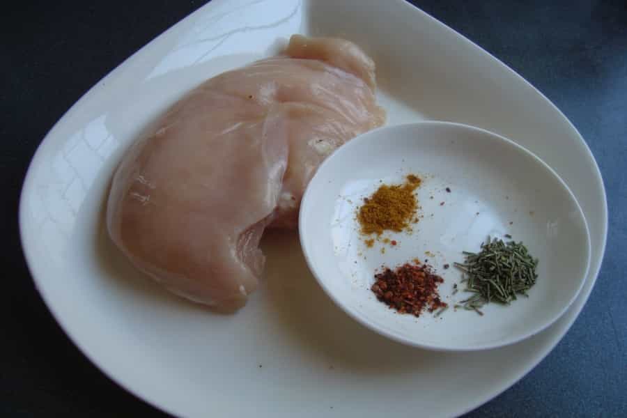 En un pocillo, mezclar el jugo de 1 limón, merquén, romero, curry, 3 cucharadas de aceite de oliva y sal a gusto. Pincelar las cintas de pollo con la marinada. Dejar reposar por 15 minutos.
