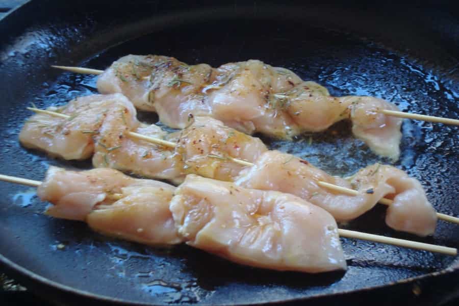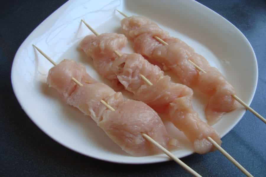 Cortar en tiras y ensártalas en palos de brocheta en forma de zigzag. Reservar las cintas de pollo.
