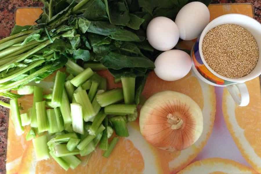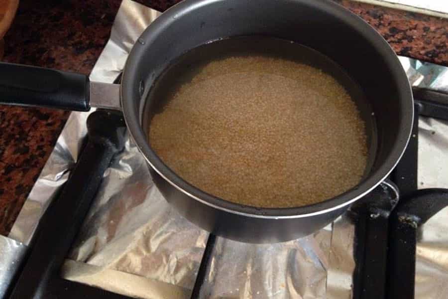 Al mismo tiempo, prepara la quinoa. Primero lávala muy bien bajo un chorro de agua. Por una taza de quinoa, agrega otra de agua agua caliente y deja hervir en una olla a fuego medio.