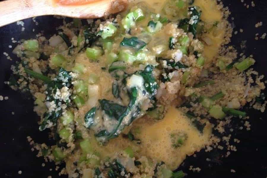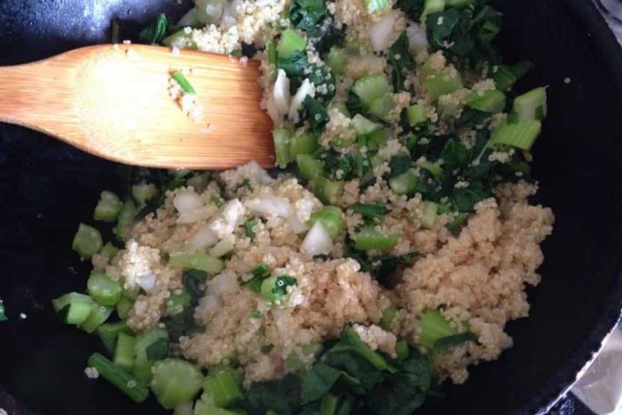 Cuando ya esté dorada, agrega la espinaca con el apio y la quinoa. Mezcla bien los ingredientes y deja que reposen a fuego lento.