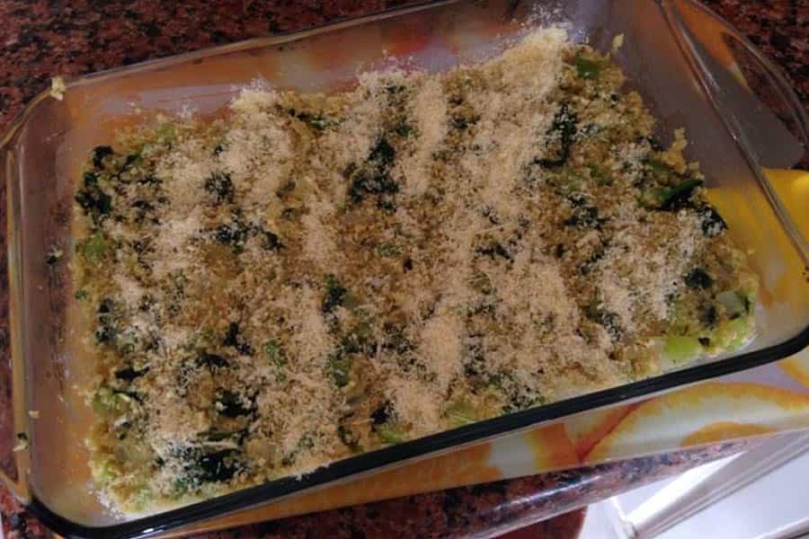 Pon mantequilla a una fuente y agrega toda la mezcla lista ahí. Normalmente le pongo queso rallado encima, para que quede más dorado, pero este paso es opcional. Déjalo en el horno durante 30 minutos a 200 grados.