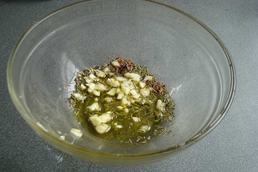 En un pocillo, mezclar ½ taza de aceite de oliva, merquén, romero, orégano, sal de mar a gusto y los ajos picados finamente.