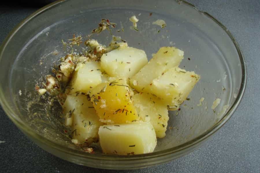 Pelar las papas, partirlas en cuartos y cocinarlas a fuego medio en abundante agua. Dejar hervir por 5 minutos y apagar. Escurrir, dejar enfriar y reservar. (Las papas deben quedar al dente para terminar su cocción en la parrilla).
