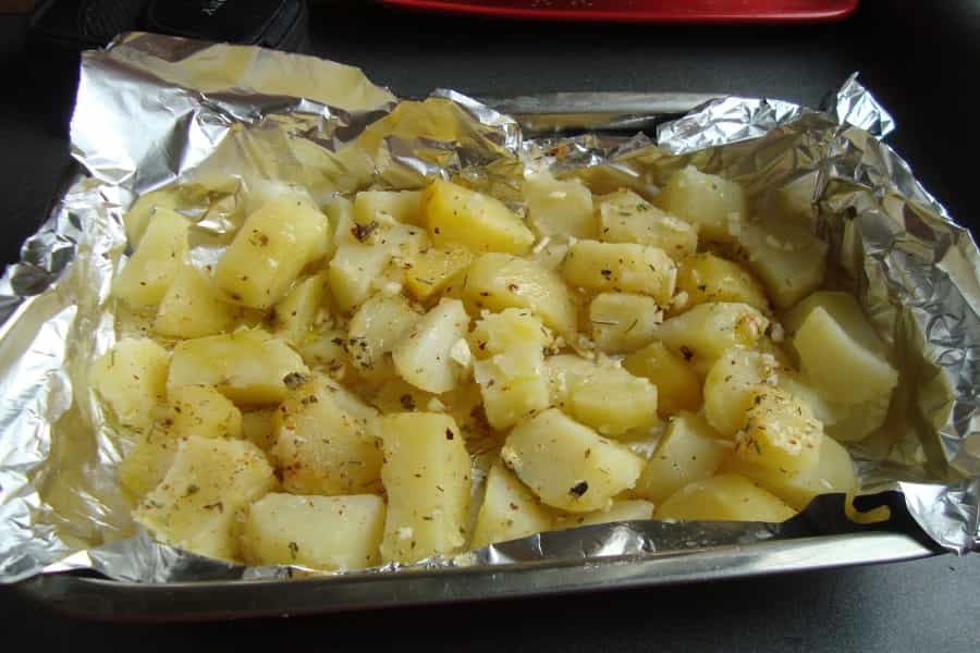 Forrar una fuente con papel alusa, vertiendo las papas con su marinada de ajo y especies. Bañar con un poco de aceite de oliva.