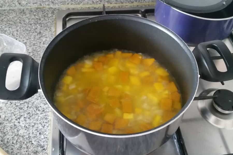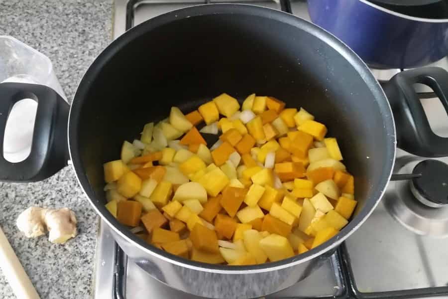 - Primero debemos cortar en cubitos pequeños el zapallo, la papa y la cebolla. Rallamos el jengibre y llevamos todo a una olla mediana con dos cucharadas de aceite de oliva. Esperamos que los ingredientes tomen un poco de color.