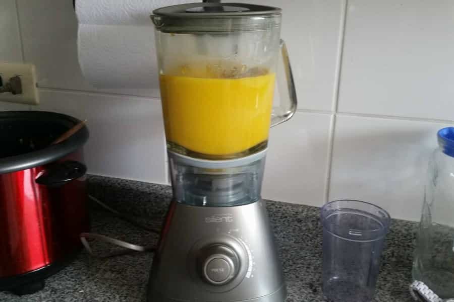 - Cuando ya se encuentra tibio, lo separamos en dos y llevamos cada parte a la licuadora. Procesamos durante unos minutos y las volvemos a juntar en la olla.