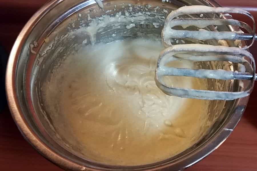 Bate la margarina con el azúcar, hasta lograr un líquido sin grumos. Agrégale las yemas, bate, e incorpora los polvos de hornear y la harina, alternando con la leche. Mezcla bien hasta que se forme una pasta.