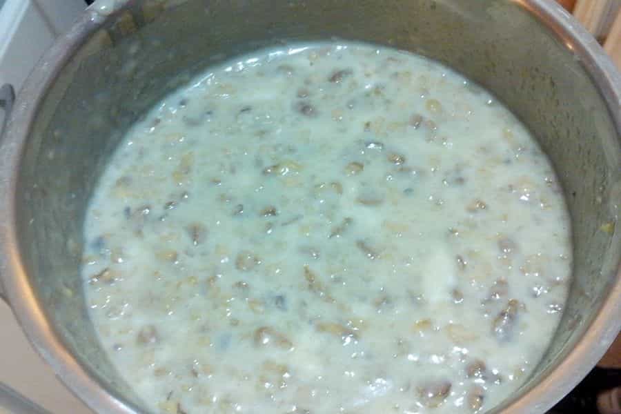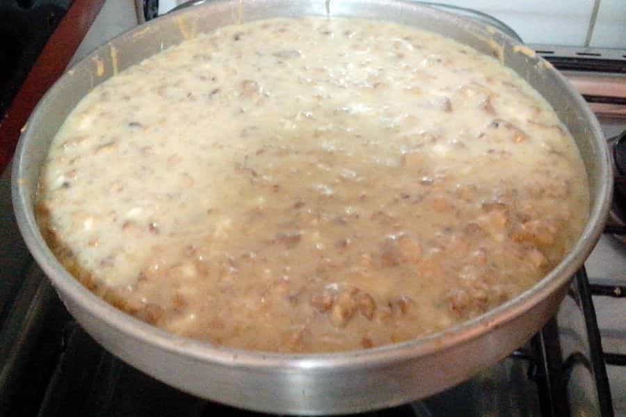 Mientras tanto, realiza el relleno. En una olla pon la margarina, la leche condensada y las nueces. Caliéntalas a fuego lento, y revuelve hasta lograr un tono acaramelado. Una vez listo, retira del fuego, agrega el huevo y mézclalo con el resto de los ingredientes.