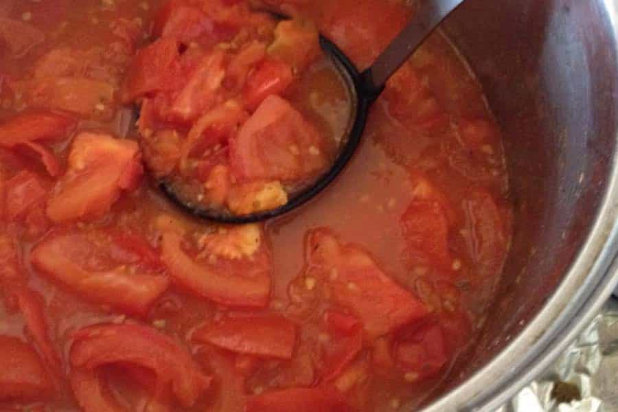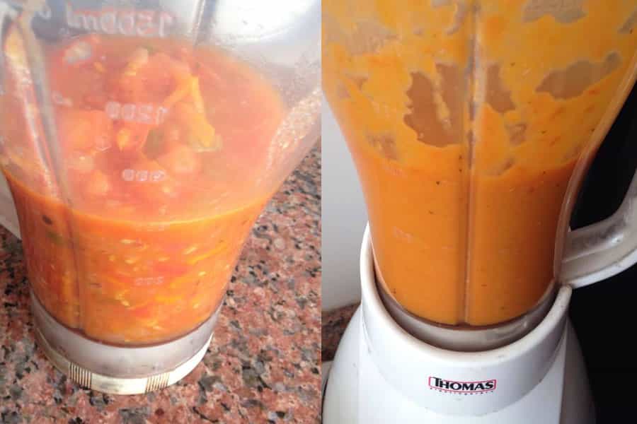 A los 40 minutos, sacarás un poco de la preparación y la pondrás en la juguera. Esto lo hago porque no me gusta sentir tantos trozos de tomate. Entonces, licuo la mitad y la otra la dejo como está en la olla. Si te gustan los trozos de tomate, este paso no es necesario. También puedes licuar todo, pero después dejar que siga cociéndose en la olla.