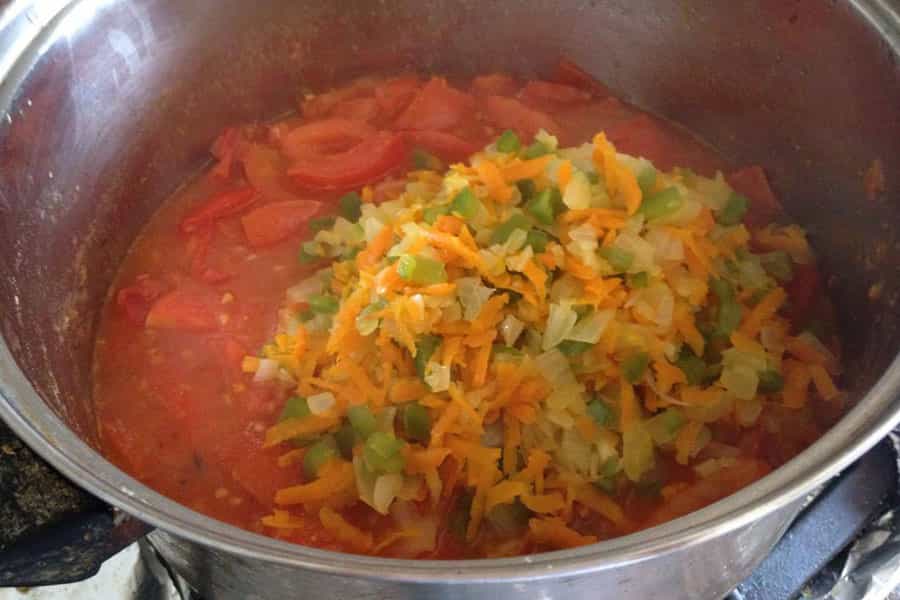 Es en ese momento cuando agregarás la cebolla, las zanahorias y el pimentón. Debes ir probando y viendo si le falta sal u otros aliños. Es en este punto donde yo suelo agregarle una hojas de albahaca (es opcional).