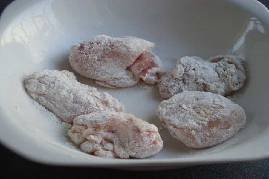 Cortar el pollo en cubos o tiras. Pasar el pollo por la harina, luego por huevo batido y nuevamente por harina.