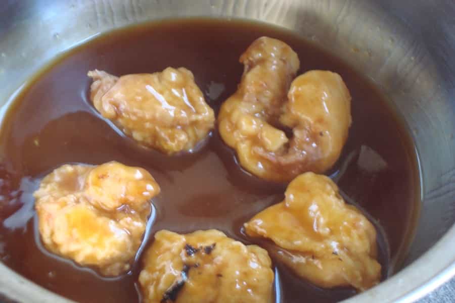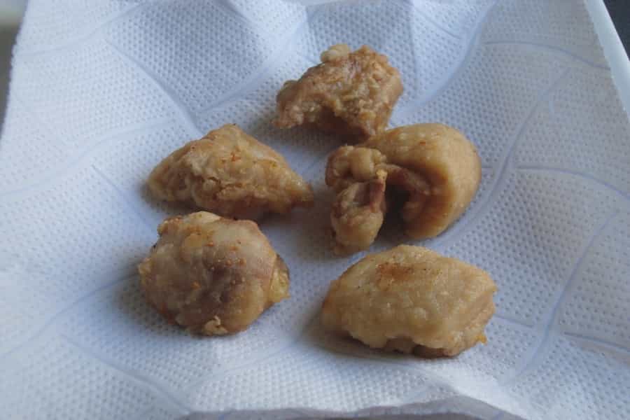 Freír los trozos de pollo en aceite caliente. Deben quedar levemente dorados por todos lados. Retirar y traspasar a un plato con papel absorbente. Reservar.