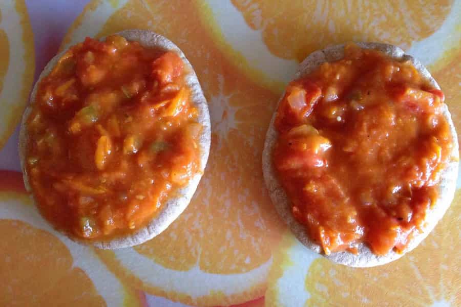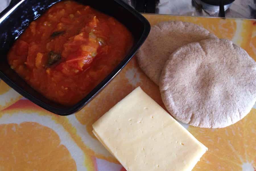 Yo tenía preparada salsa de tomate casera. Esta incluye cebolla, pimentón y zanahoria. En el caso de no contar con este deleite hecho en casa, puedes usar salsa envasada y agregarle a tu gusto las verduras que desees. Debes ponerla sobre el pan pita cerrado. Yo le pongo harta salsa, porque después - en el horno - se seca un poco.