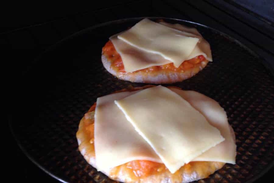 Cuando hayan pasado 10 minutos, coloca el queso encima. Yo le puse dos láminas por pan pita. Así, en los 5 minutos restantes, el queso se derretirá lo suficiente.