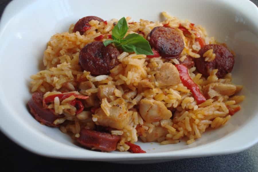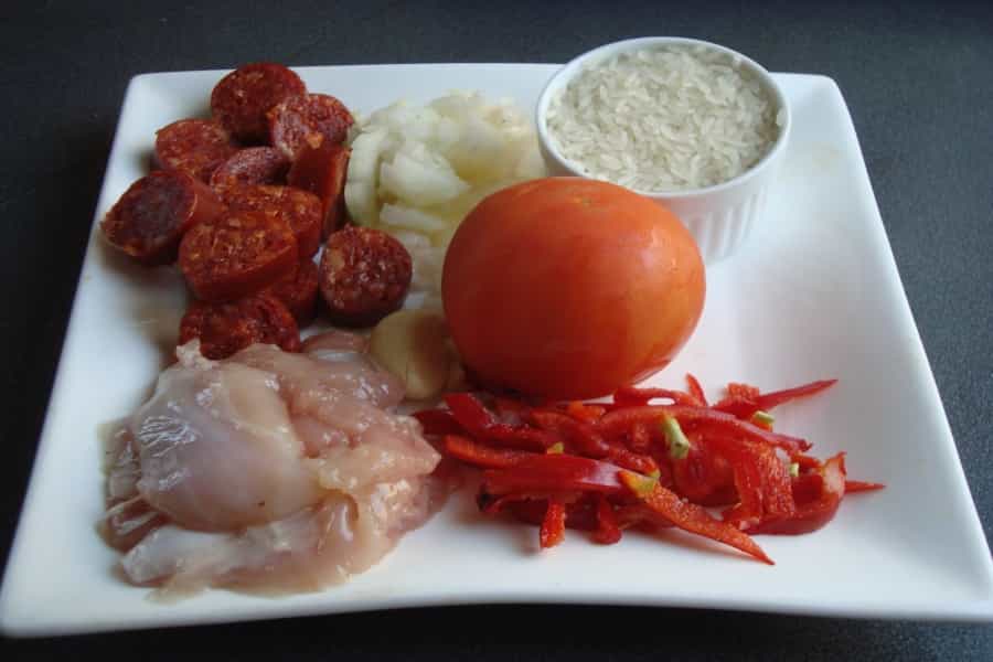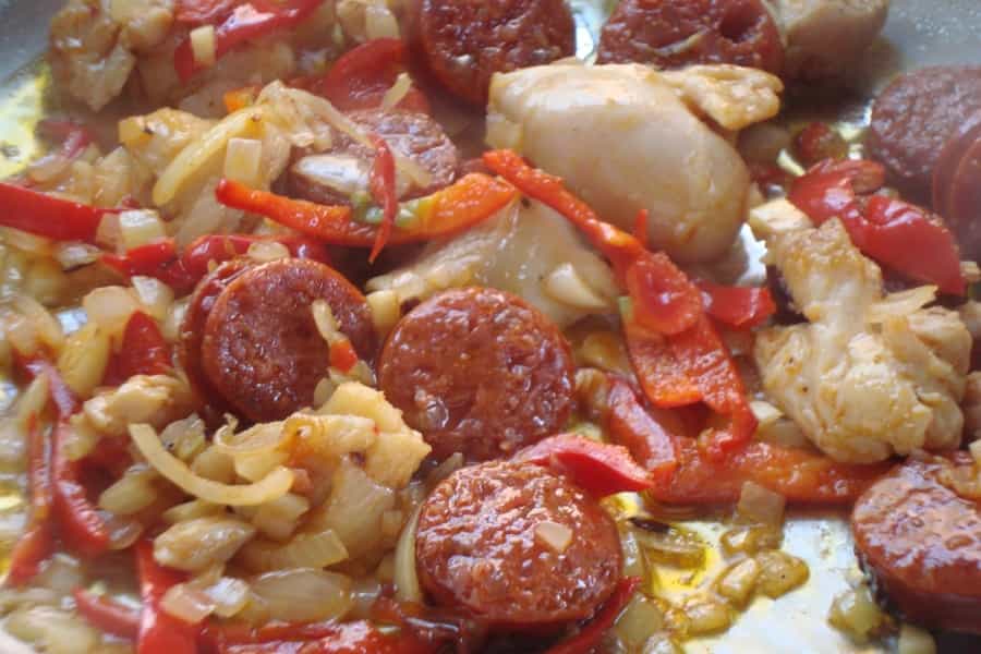 En un sartén con 2 cucharadas de aceite caliente, sofreír el pollo cortado en tiras o cubos pequeños. Cuando se torne dorado, añadir el chorizo riojano picado, ajo, cebolla picada en cubos y pimentón rojo picado en tiras.