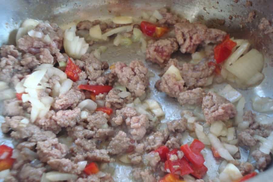 En un sartén con 2 cucharadas de aceite caliente, freír la carne molida, cocinando hasta que cambie de color. Agregar la cebolla picada en cubos pequeños, pimentón picado, el ají picado limpio y sin semillas. Freír a fuego alto, revolviendo constantemente hasta que la cebolla se torne transparente.