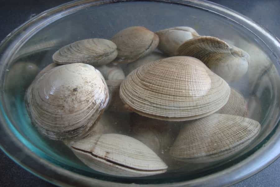 Lavar las almejas y dejarlas en remojo en una fuente con abundante agua fría con sal por 30 minutos (es importante no mover las almejas, ya que con este proceso la arena se irá al fondo de la fuente). Transcurrido este tiempo de remojo, escurrir y reservar.
