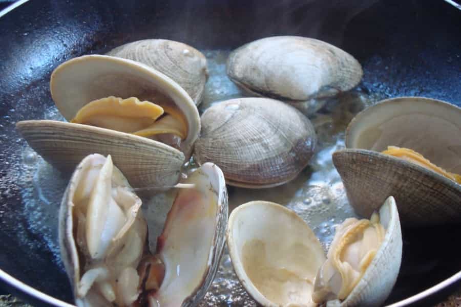 Cuando las almejas comiencen a abrirse, verter el vino, salpimentar a gusto y seguir cocinando hasta que hierva (en este minuto, el alcohol se ha evaporado. Apagar y servir. Puedes disponer las almejas en platos individuales o en una bandeja para compartir.