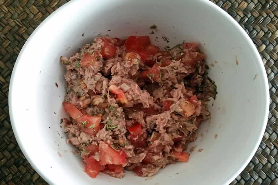 Para comenzar, haremos el relleno. Pela y pica el tomate en cuadritos. Mézclalo con el atún y agrega sal.