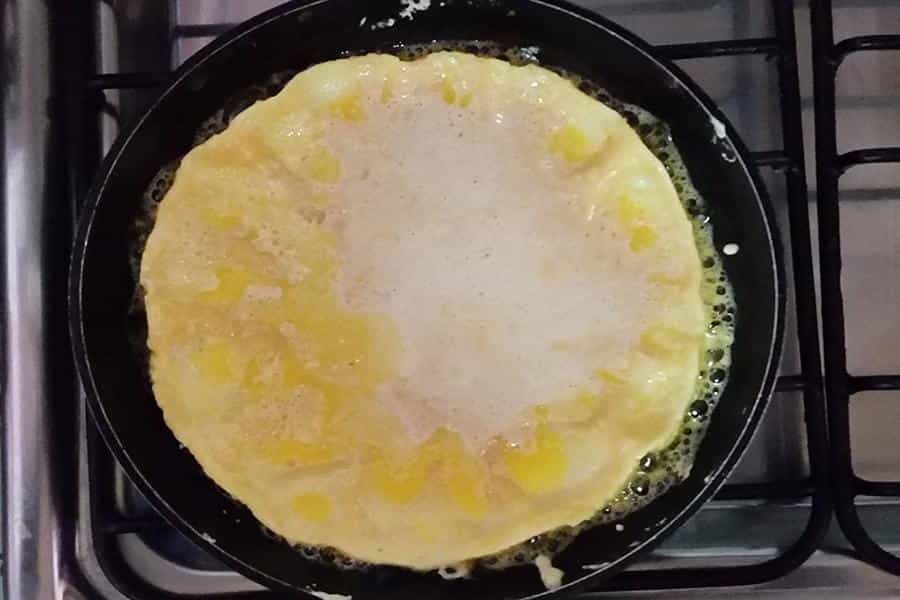 Una vez que la margarina esté líquida, incorpórale la mezcla de los huevos con la harina. Verás que se forma una especie de tortilla. Eso sí, procura que no se pegue en los costados. Para ello, te recomendamos cocinarla a fuego bajo e ir despegando los bordes con una espátula.