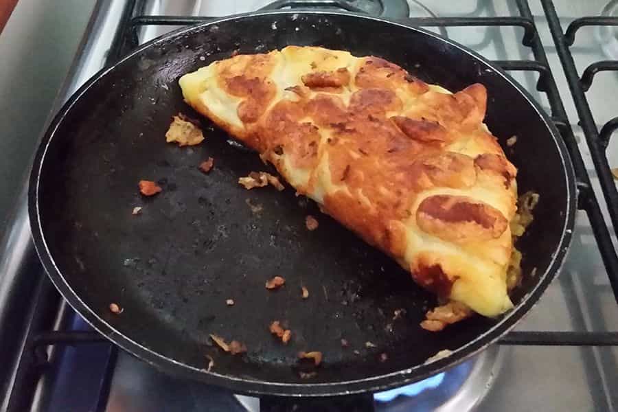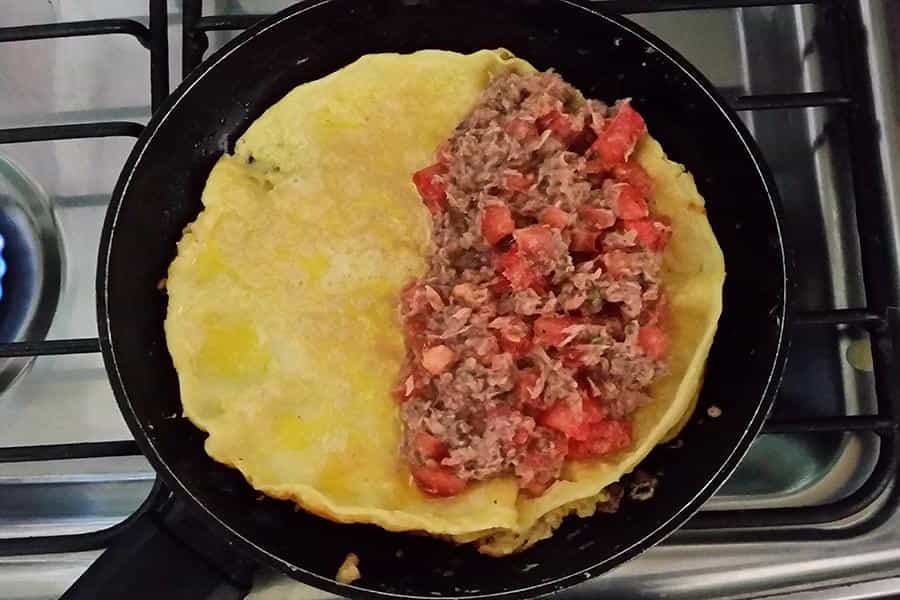 Pasados 6 minutos de cocción o cuando veas que la tortilla tenga consistencia y esté dorada; agrega el relleno. Ubícalo en un costado de la tortilla, para que te quede espacio para darle un doblez.
