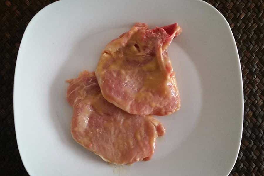 Lo primero que haremos será lavar las chuletas y embetunarlas con la mostaza. Preocúpate de que todos sus recovecos queden bañados con el condimento.