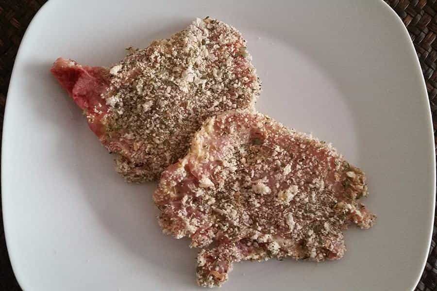 El siguiente paso es bañar las chuletas con la combinación de pan, orégano y sal. Te aconsejamos hacerle unos pequeños cortes, de manera que se impregne bien de los ingredientes.